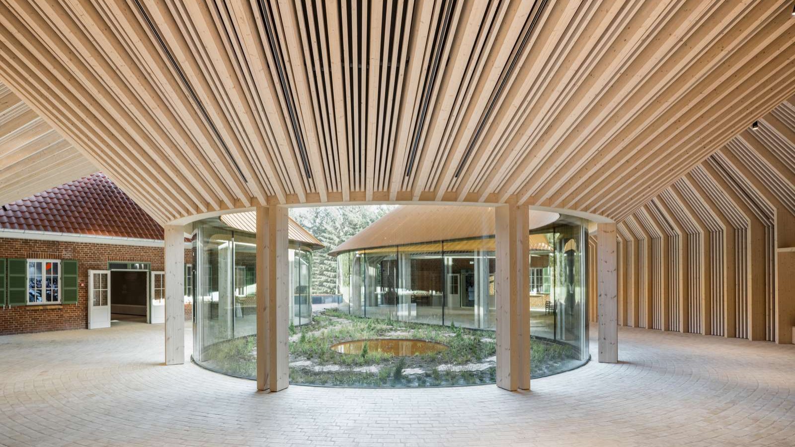 Bir zamanlar mültecileri barınma alanlarının yer aldığı iç avlu ve orman pencerelerin arkasından görülebiliyor. Yeni bina fuaye, vestiyer, müze mağazası ve bilet gişesinin yanı sıra sıhhi tesisat alanlarına da ev sahipliği yapıyor. Rezervuarlar ve Mapress temin sistemi Geberit tarafından tedarik edilmiştir.