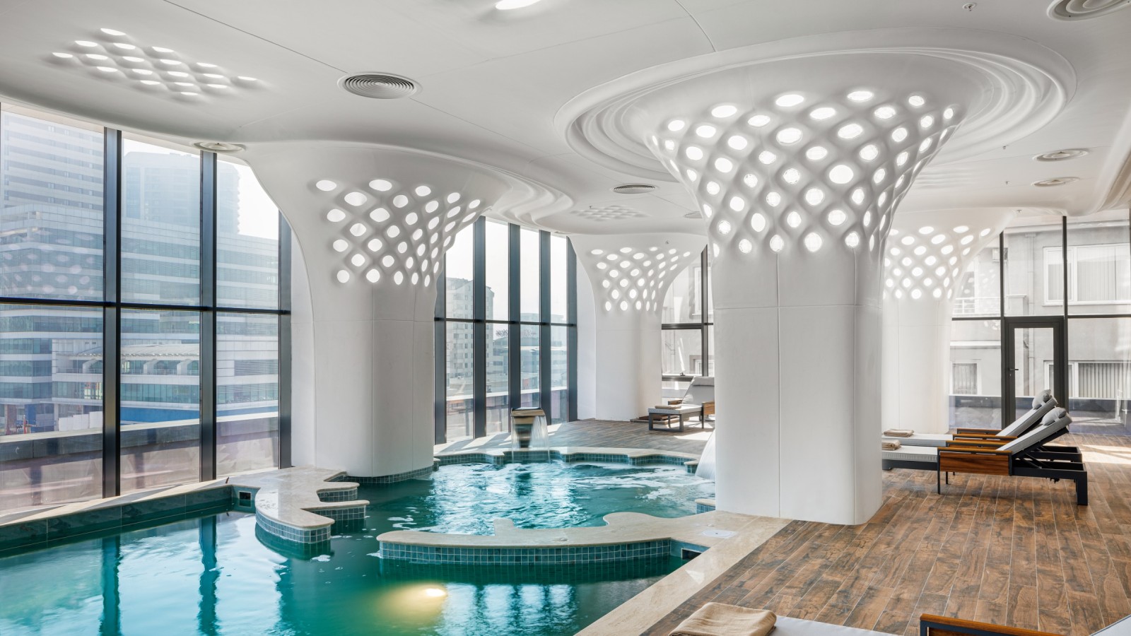 Fütüristik lobi, yapının dikkat çeken merkezi unsurlarından biri olarak öne çıkıyor: organik formlar, bol miktarda beyaz ton, ve zemin katla birinci kat arasında uzanan metrelerce yüksekliğe sahip yapısal kolonlar. Mimar Yunus Emre Kara, “Doruk Nilüfer Hastanesi için yaptığımız sözleşme, iç mekân tasarımını da kapsıyordu,” diyerek kapsamlı bir yaklaşım benimsediklerini belirtiyor. Hedef; uluslararası standartlarda hizmet sunan ve aynı zamanda tasarımıyla ilham veren bir hastane yaratmaktı. Bu hedefe ulaşıldı: dikkat çekici hastane binası, 2024 Dünya Mimarlık Festivali’ne seçilen projeler arasında yer aldı.