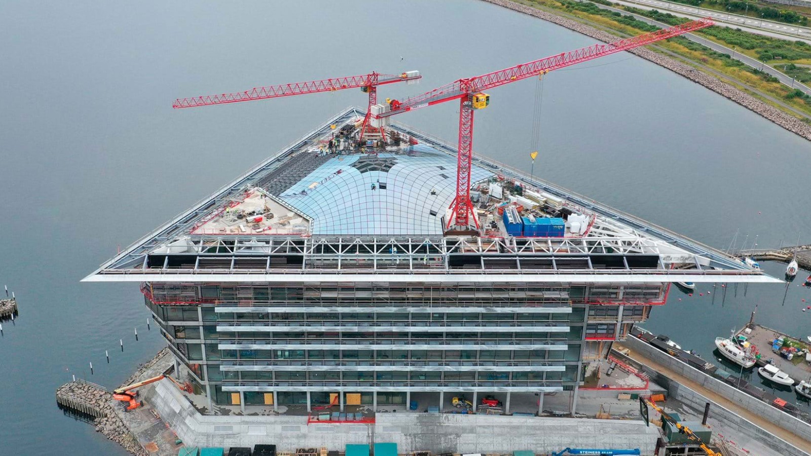 Çatının bu cam konstrüksiyonu aynı zamanda Foster&Partners mimarları için bu projedeki en büyük zorluklardan biriydi. Binanın doğrudan Baltık Denizi'ndeki konumu, kış fırtınaları sırasında rüzgara ve hava koşullarına dayanmasını gerektirdiğinde sağlam bir konstrüksiyon olmazsa olmazdı. Devasa kubbeli çatının çatı drenajı ve üç taraftaki çatı çıkıntısı da Geberit açısından olağanüstü bir görevdi. Şirket, su temin sistemlerinin yanı sıra Pluvia çatı drenaj sistemini de projeye kattı. Dtek inşaat firmasına Geberit ürünlerinin kullanımı konusunda tavsiyede bulunan Lennarth Dahl ““Teknik departmanımız, Pluvia drenaj sisteminin kurulumu için doğru yeri ve yapıyı bulmak için özel hesaplamalar yapmak zorunda kaldı” diyerek şu şekilde devam ediyor: “Çatı drenaj sisteminin en iyi şekilde çalışabilmesi için yağmur suyunun kubbeden çatıya nasıl sızacağını tam olarak hesaba katmamız gerekiyordu.”